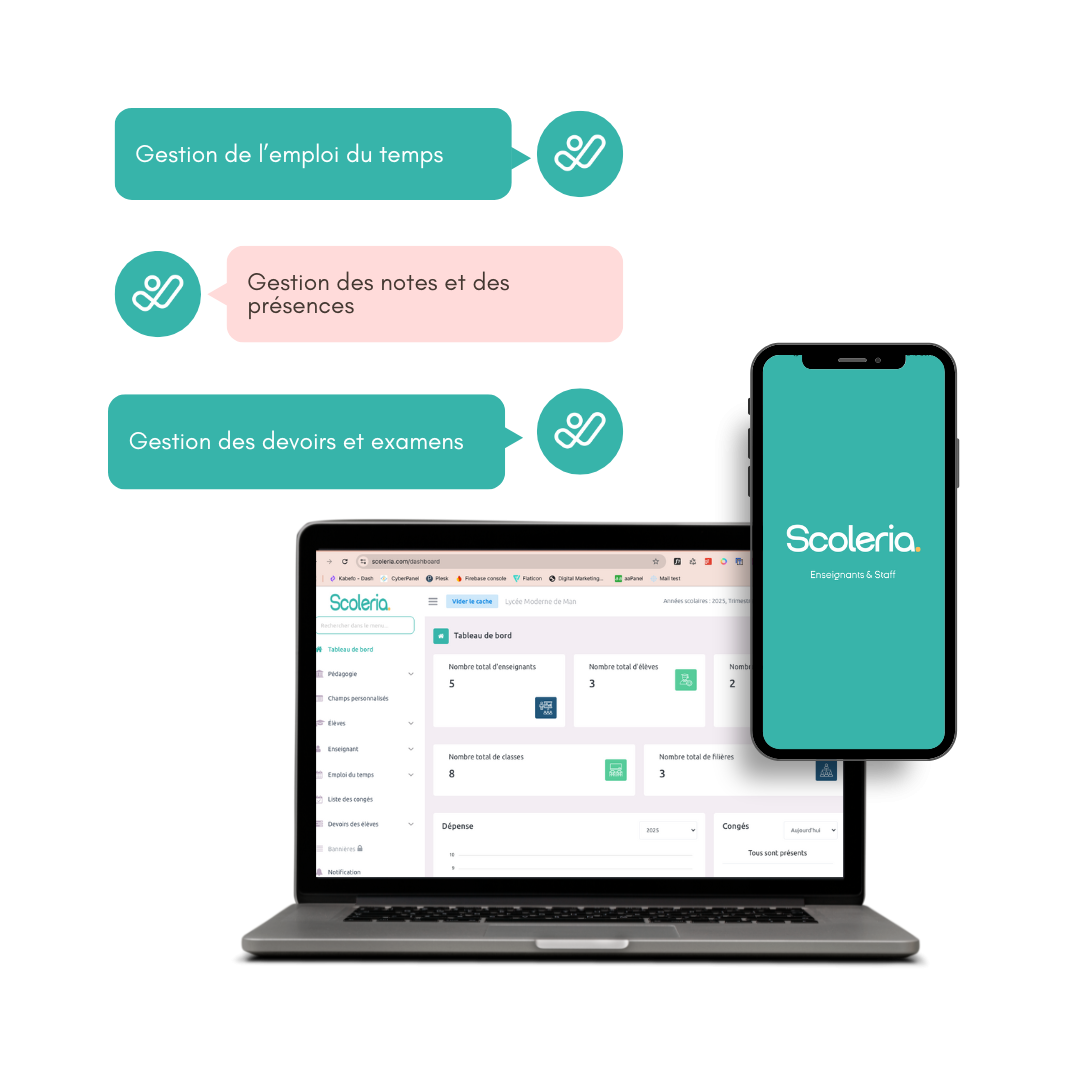 Scoleria centralise toutes les informations de la vie scolaire : suivi des notes, gestion des emplois du temps, devoirs, annonces et notifications en temps réel